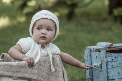 A simple vest pattern with garter and eyelet detail, and a matching bonnet with garter stitch ties.