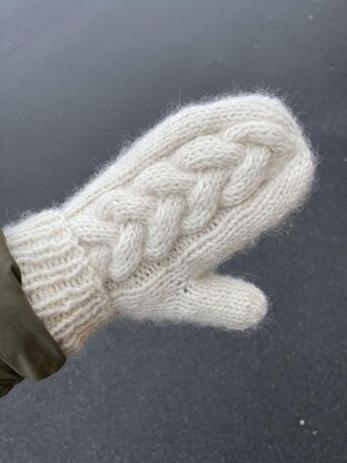 The Aviaja mittens are a pair of warm and soft mittens with a braid in the centre. The mittens are worked from the cuff up on 5 mm needles with one strand of Drops Lima and one strand of Drops Brushed Alpaca Silk.