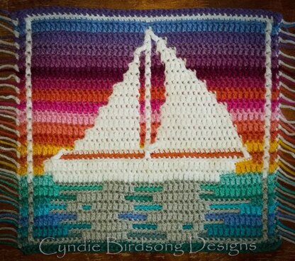 You will need at least 4 colors of yarn - two for the background (water & sky) and two for the sailboat & it's shadow. You could also use variegated yarn for the background. The sample image uses many different colors for the background rows, although one color for the water & another color for the sky would also look good.