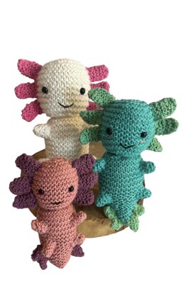 These Axolotls are very easy to make so they are suitable for beginners. They are knit using 2 straight needles, in garter st all throughout. Using the same pattern you can do three different sizes.