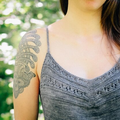Worked from the top down, the front starts with a lace section that pairs as an easy way to create a flattering sweetheart neckline, while the race back is comfortable to wear. From the underarm to the bottom, the top is worked in the round in almost plain stockinette rounds, ending with a simple lace pattern at the bottom. The straps are knit as icords, joining the front and back at the shoulders.