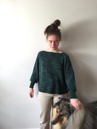 Oversized sweater, with large raglan sleeves. Design to be loose and comfortable, causual wear with a feminin touch. Knit in the round topdown. For an oversized version you can knit it 2 sizes up.