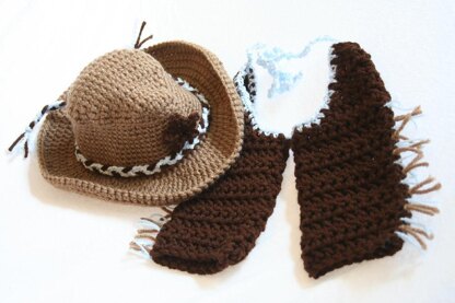 Creating this cowboy costume pattern was really a lot of fun! This pattern includes the cowboy hat and fringed chaps. Cowboy hat features a braided accent and a sheriff's star! Pattern is detailed and easy to follow!