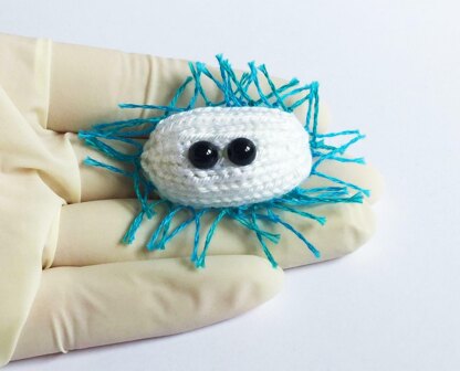What you will need: 2 knitting needles (US1/2.25mm or as per tension advice), 5g DK yarn per bacterium (e.g. Sirdar Cotton DK 501 ‘Mill White’), Two black plastic toy safety eyes - 6mm, Oddments of embroidery floss for the pili, Polyfil toy stuffing, 1 tapestry needle for finishing,1 embroidery needle for finishing