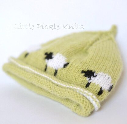 Little Pickle Knits collection by Linda Whaley. An adorable little lamb pixie beanie hat. The little lambs run all around the hat. Worked flat on single pointed needles for easy intarsia knitting.