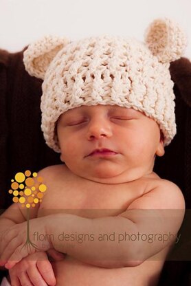 This is a PDF file for a crochet pattern to complete an adorable bear hat. This makes a great hat for a photo shoot or a photographer who needs photo props!
