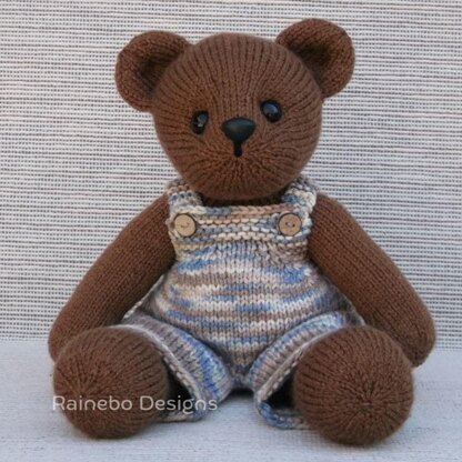 This Baby Bear, with his darling face, little muzzle, and chubby belly, is knit in-the-round using Magic Loop (or Double Pointed Needles), and the arms, legs, and body are all one piece. Sitting approx. 9 ½” tall, Baby Bear is worked in worsted wt. (Aran/10-ply) yarn, using approx. 250 yds. His removable overalls are worked in the same weight yarn, using approx. 100 yds. Baby Bear will become a special friend to someone you love.