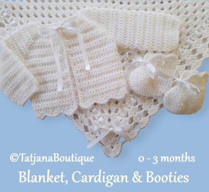 Crochet Pattern baby blanket, cardigan and booties set decorated with satin ribbon. ♥♥♥ Blanket pattern in size 25" x 25" (65cm x 65cm) - an ideal sizes for prams, pushchairs, car seats and moses baskets. Cardigan & Booties size 0 - 3 months. The pattern is written in US crochet terms but with a conversion at the beginning of the pattern to UK / Australian terms. Its just that some of the names of the stitches are different. Materials & tools you will need: ★ Acrylic or other yarn in white colour approx. 300 gr - DK, Double Knitting in UK, Light Worsted in the USA, 8ply in Australia. ★ Crochet hooks sizes 4 mm, 5 mm and 6 mm. ★ Satin ribbon in white colour 5.5 m (1 cm wide)