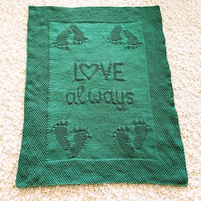 «Love Always» as in «Love for ever», but also «Never forget to love». Both meanings are wonderful wishes for a newborn baby. And the cute little baby feet make the blanket even more special. No matter if you knit the blanket for your own child or for parents-to-be, it certainly will bring joy and will be appreciated for a lifetime.