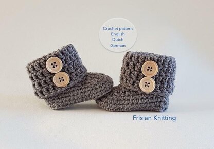 You can download an PDF file showing the pattern 4 sizes booties, each size has its own description and crochet chart. The description for 12 cm supplemented with clear pictures.