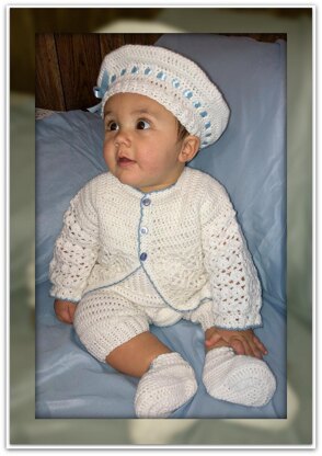 Pattern includes jacket, romper that buttons at shoulders, beret, and booties in 2 sizes.