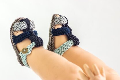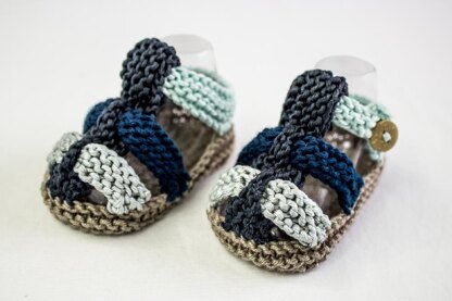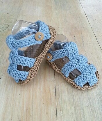 This is a pattern for an adorable pair of knit summer sandals Treat the special little boy in your life to a pair of super cute cotton summer sandals! So easy to knit, quicker than booties for sure. They feature a garter stitch sole and straps. Use any colour combination you like or make them in one colour. Great for using up remnant bits!