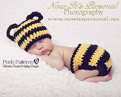 This is a precious little set featuring a very cute bumble bee theme. It is very gender neutral and suitable for boys or girls. Includes directions for the hat and diaper cover. Also makes a fabulous photo prop!