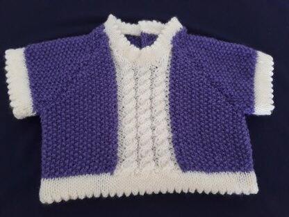 Easy little sweater combining moss stitch with an easy cable. Ideal for beginners to attempt something a little more adventurous. The easy repeat cable is over 4 rows. Although contrasting colours have been used in this pattern, the sweater would look equally as good in a single colour.