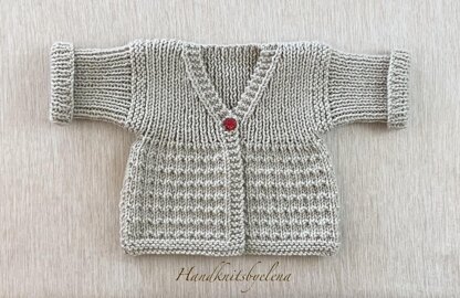 This cute baby cardigan is very easy and fun to knit! The back and two fronts are made separately from the bottom up. The stitches for the sleeves are picked up along the armhole edges and the sleeves are worked flat.