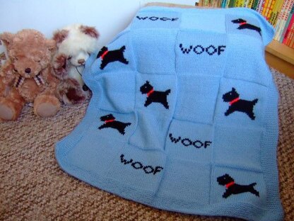 The blanket is knitted flat on circular needles and in one piece (including the border), so no picking up stitches or sewing squares together - just sew in the ends when you're finished! The dog motif is knitted following an easy chart using the Intarsia method, which is why the pattern is more suited to intermidiate level. But the chart is so simple it would make a good project for someone new to colour knitting. The "WOOF" words and dogs' eyes are embroidered on afterwards using duplicate/Swiss darning stitch and French knots.