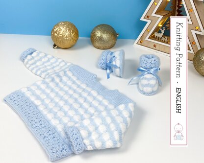 Wrap your little one in the soft embrace of the Baby Clouds outfit, a winter wonderland of cozy elegance knitted with soft baby superfine yarn. In a soothing light blue adorned with a whimsical white "clouds" motif, this ensemble captures the magic of the season. The delicate snowflake lace design graces the bottom of the sweater and sleeves, adding a touch of holiday enchantment.
