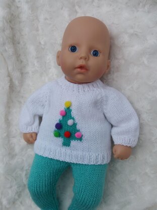A pattern for two festive sweaters and an elf outfit in two sizes for baby dolls 12" and 14". Knit on straight needles throughout. The motif is worked using the block colour method (intarsia) I have given tips and a link for anyone new to this. I've used small craft pompoms to decorate the tree but, if for a small child, french knots might be more suitable. The snowman is decorated with eyes, sticks for arms, an orange nose and crochet scarf. The leggings are shaped using the short row method and again full instructions are included.