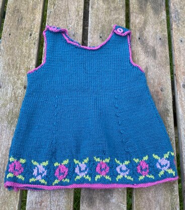 This dress was inspired by Spring and I thought it would be great to design a dress that could be worn on its' own or with a tee shirt or blouse underneath it. It is knitted in a sports weight machine washable yarn