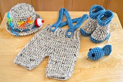 Materials Needed: US "H" crochet hook US "I" crochet hook US "K" crochet hook 1 skein Vanna's Choice yarn Accent color for boots, suspenders & fish Scraps for "flies" on hat 1 1/4" fishing bobber 2 5/8" buttons Tapestry Needle Scissors