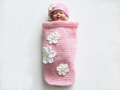 - Hat and Cocoon require a 5 mm crochet hook. Flowers require a 4 mm crochet hook. Small amount of white and yellow yarn is required for flowers.