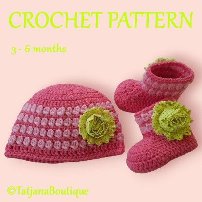 Crochet pattern baby hat and ballerina booties decorated with flowers. ♥♥♥ Size in this pattern 3 - 6 MONTHS.
