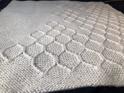 Baby Honey Blanket is a garter stitch blanket with textured hexagons, resembling honeycomb. The pattern is asymmetric over the blanket, to reflect the asymmetry found in nature.