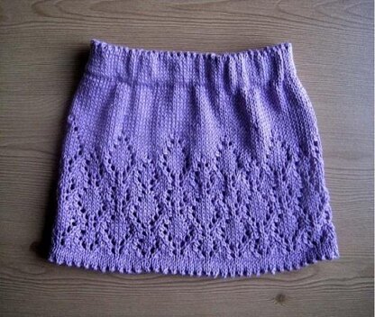 A pretty lacy skirt with a picot hem and waistband. Worked in the round from the hem up, the lace pattern is in charted form only.