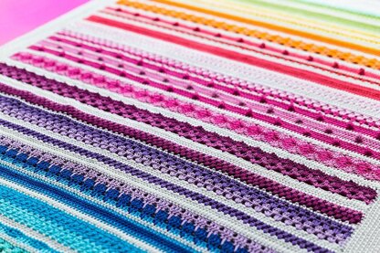 The Baby Rainbow Sampler Blanket contains all the versatility of the original version in a smaller size. 13 different stitch patterns make this blanket the perfect learning project for any ambitious beginner who wants to venture into some new stitches and create something colourful in the process.