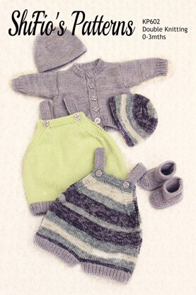 Very cute baby set, comprising of a romper suit with matching cardigan, hat and booties, the striped set is made with self striping yarn. size 0-3mths instructions in the pattern Made using double knitting yarn