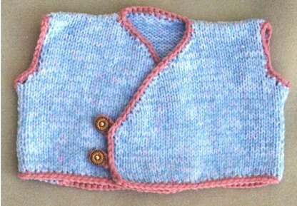 Super easy to knit! In sizes 12 to 24 months. It has a bit of an oriental look, but can be wrapped from side to side, or either side. Knit this up quickly with multiple strands of baby yarns, and knitting needles US # 8. This works up so fast, that you can whip up several colors for baby gifts! This is a nice winter wear to go over tops and shirts and even sleepwear.