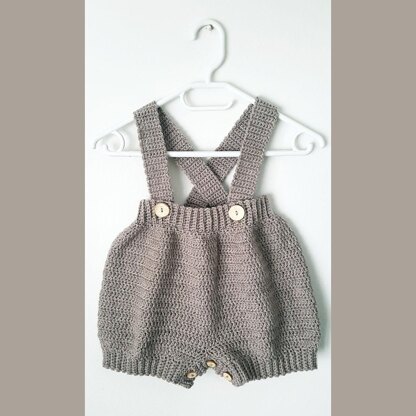 An adorable pair of shorts for boys or girls that are baggy around the hips. These shorts have suspender straps that attach to the shorts with buttons and can be adjusted with the button placement. It also has a crotch opening with buttons for easy nappy changes.