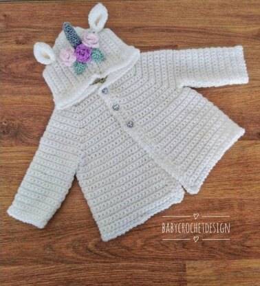 This cute Baby Unicorn Dreams Hooded Jacket is crochet from the top down in single crochet (double crochet UK).