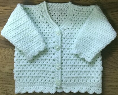 Crochet pattern for baby's/child's v-neck cardigan with all over pattern in double knitting yarn. Using UK Terminology.