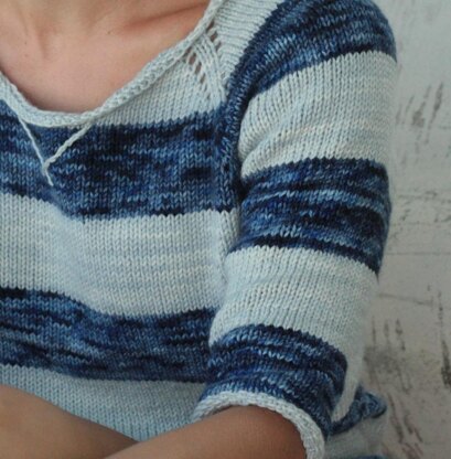 A relaxed pullover featuring large blocks of handdyed yarn to resemble watercolor painting, Backshore features short row shaping at the shoulders for a perfect fit and positive ease for that laid back style.