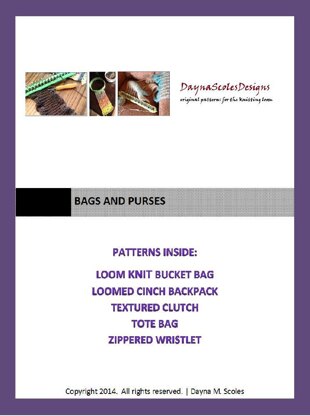 Have fun making bags, totes, and purses for yourself or as gifts! This 36 page eBook includes five unique loom knit patterns:Loom Knit Bucket Bag, Loomed Cinch Backpack, Textured Clutch, Tote Bag, and Zippered Wristlet. See the individual listings for descriptions of each bag.