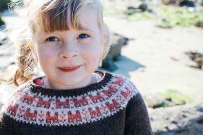A bairns (children's) version of my Crofthoose Yoke. This pattern is knit entirely in the round with extra stitches cast on at the centre back and worked in a stripe pattern as indicated in the chart. When the jumper is finished the steek is reinforced, cut open and a buttonband picked up.