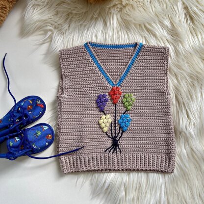 Lovely crochet vest for kids in 6 different sizes ranging from 3 months up to 5 years old. It has a lovely "bunch of balloons" at the front created with bobble stitches. The classic V neck makes this super stylish and comfortable wear for kids.