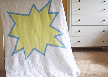 This modern crochet baby blanket features a classic comic book "BAM!" or "POW!" graphic. Bobbles subtly allude to half-tone to complete the comic book motif.