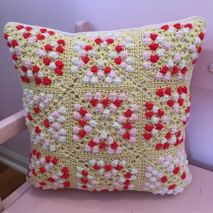 My banana split pillow is my third ice cream shop inspired pillow. Since I always crochet with ice cream colors, this summer, I have been making some pillows that are inspired by an old-fashioned ice cream shop! The front side is composed of nine granny squares. The colored cluster stitches give some texture to the squares. There is a chart included for the granny square. The back of the pillow is simply a large light pink traditional granny square. The pillow is joined along three sides, and the bottom is held together by five buttons. This allows the pillow case to be taken on and off of the insert. There are step by step pictures included throughout the pattern to help you. I used MillaMia yarn, but any sport weight yarn will work. You will need two balls of the color of the front side, 2 balls of the color of the back side, and one ball of each of the colors of the cluster stitches. You will also need a 14 by 14 in pillow insert and 5 buttons (1.5 cm in diameter).