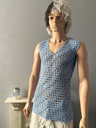 This crochet pattern is for a classic men's tank top, with diagonal stripes resembling a Barber’s pole. The shirt is a mesh design using increases and decreases to create the pattern. The design is for a sleeveless, v-neck shirt.