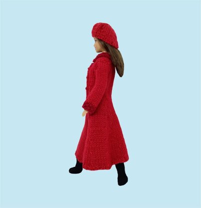here is a version of the famous Kate Middleton red coat designed to fit a Barbie - 12" fashion doll. The pattern includes a matching hat and boots. Worked on 3.25mm straight needles. The buttons are embroidered and the coat slips easily over the doll's head.
