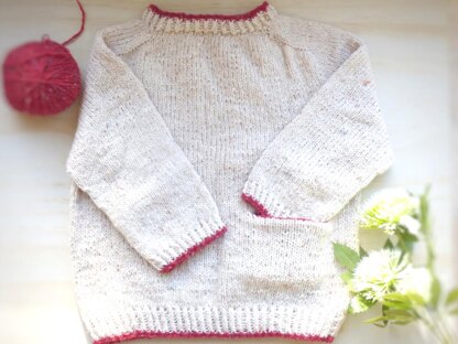Welcome to the Barleycover Sweater PATTERN for babies and children to 7 years. Seamless and knit top down, Barleycove is a classic jumper design wth a colourful rib trim and a pocket for treasures. It is knit with a tweedy double knitting yarn, so fairly quick to make. Unlike many top down seamless designs, BARLEYCOVE has saddle shoulders, a great new top down skill to try. All steps are explained clearly and if you need any further help, it is available via email. Named after a lovely beach in County Cork, it is a great sweater for weekend walks.