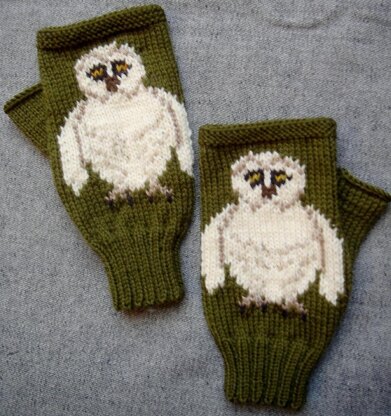 Barn Owl fingerless gloves/mitts in 4ply weight yarn - wool, cashmere or cotton could be used.