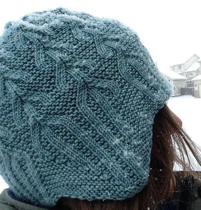 A warm, squishy aviator-style hat with knit-as-you-go earflaps formed by short-rows. This is the "In Flight" version with garter ribbed brim and outstretched wings. The stitch pattern is written and charted.