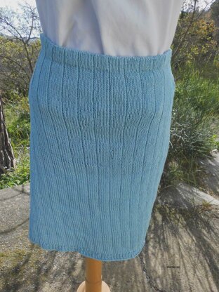 A chic straight skirt in cotton in an elegant ribbed (5/1) pattern. To work in rounds beginning from above - or if you prefer to work flat back and front separately for then to sew the side seams - both ways are included in the pattern. The decreases for the hip make a splendid fit and at the same make a discreet decoration at the side. The waist measure to adjust with the rubber band. You can use the model alone with a shirt or together with the BARONESSA NOBLE TOP. Part of the Baronessa-series which at the moment consists of 2 models. The model is suitable for all age groups. The measurements throughout the pattern are given in cm as well as inches.