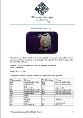 This pattern is for a thick, winter hat with an interesting basket weave pattern and cute little tassels at either corner.