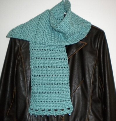 The Basket Weave Scarf has a pretty scalloped edge with the addition of beads. The dimensions are 7” x 45” long using 1 ball of soft yarn. To make the scarf longer, another ball of yarn is needed.