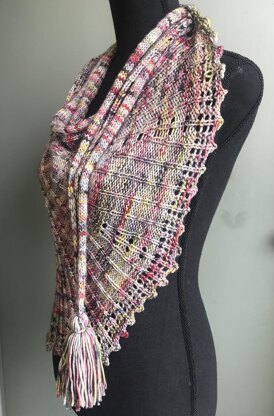 This shawl is designed to drape across the front of the body, elegantly splaying the ribs and lace edge. The shawl is flanked by i-cord edging. A tassel at the narrow end is fed through the i-cord loop affixing the shawl in place.