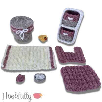 This crochet pattern will help you create cute bathroom accessories with laundry basket, towel, face cloth, bath duck, bath mat, pedestal mat, storage unit, soap and soap dish (bath and toilet are plastic props for illustration only). These will fit 12” fashion dolls and 1:6 scale doll houses.